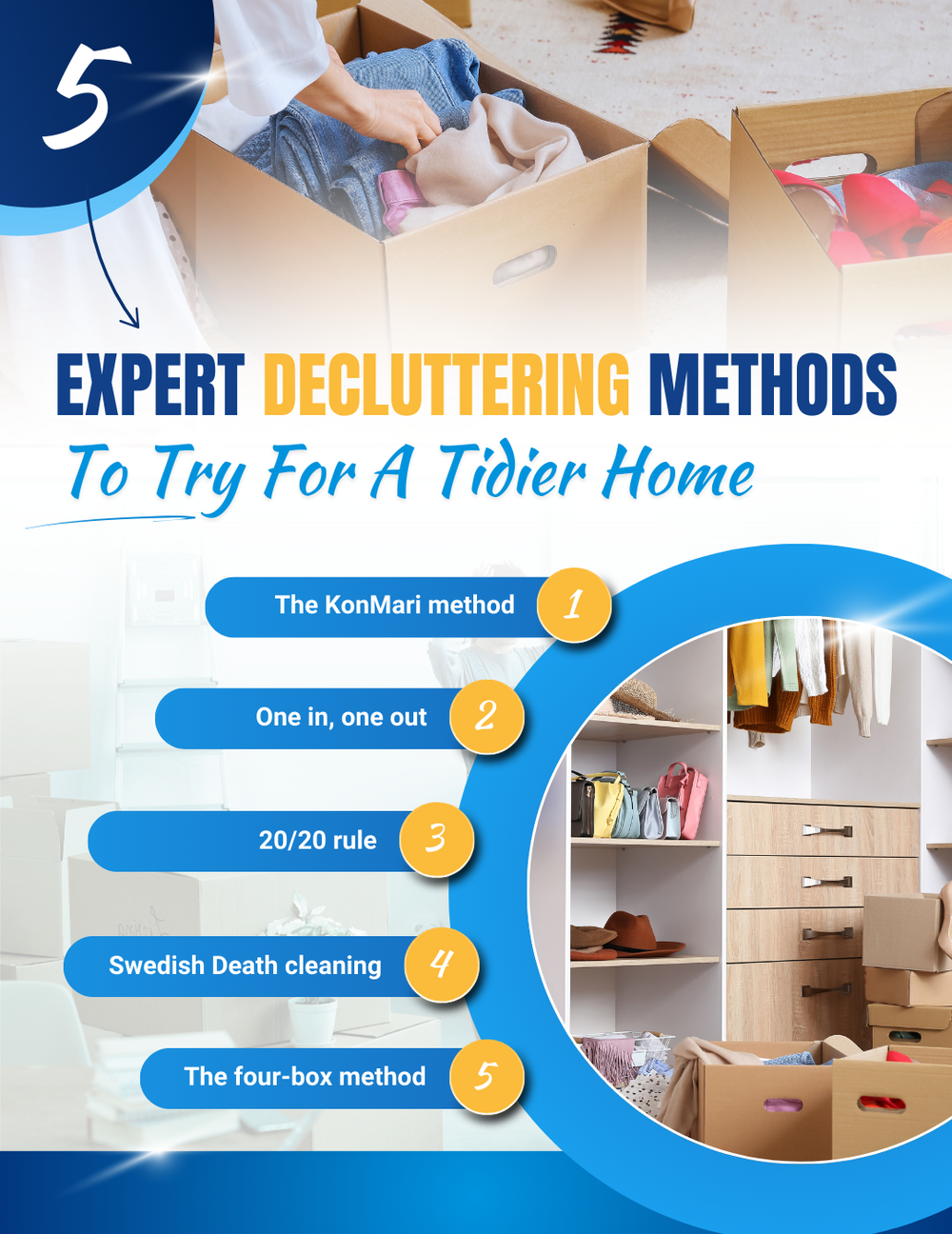 As the name suggests, all you need here are four empty boxes that you will label with their purpose. While there are some variations, most experts include the following: keep, trash or throw away, donate, and sell. Other variations also include ‘rehome' and ‘undecided.’